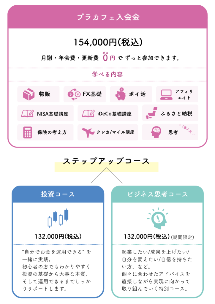 プラカフェでは「これから副業を始めたい!」「投資を始めたい!」という方におすすめな内容を、幅広く、繰り返し何回でも学んでいただくことができます。
